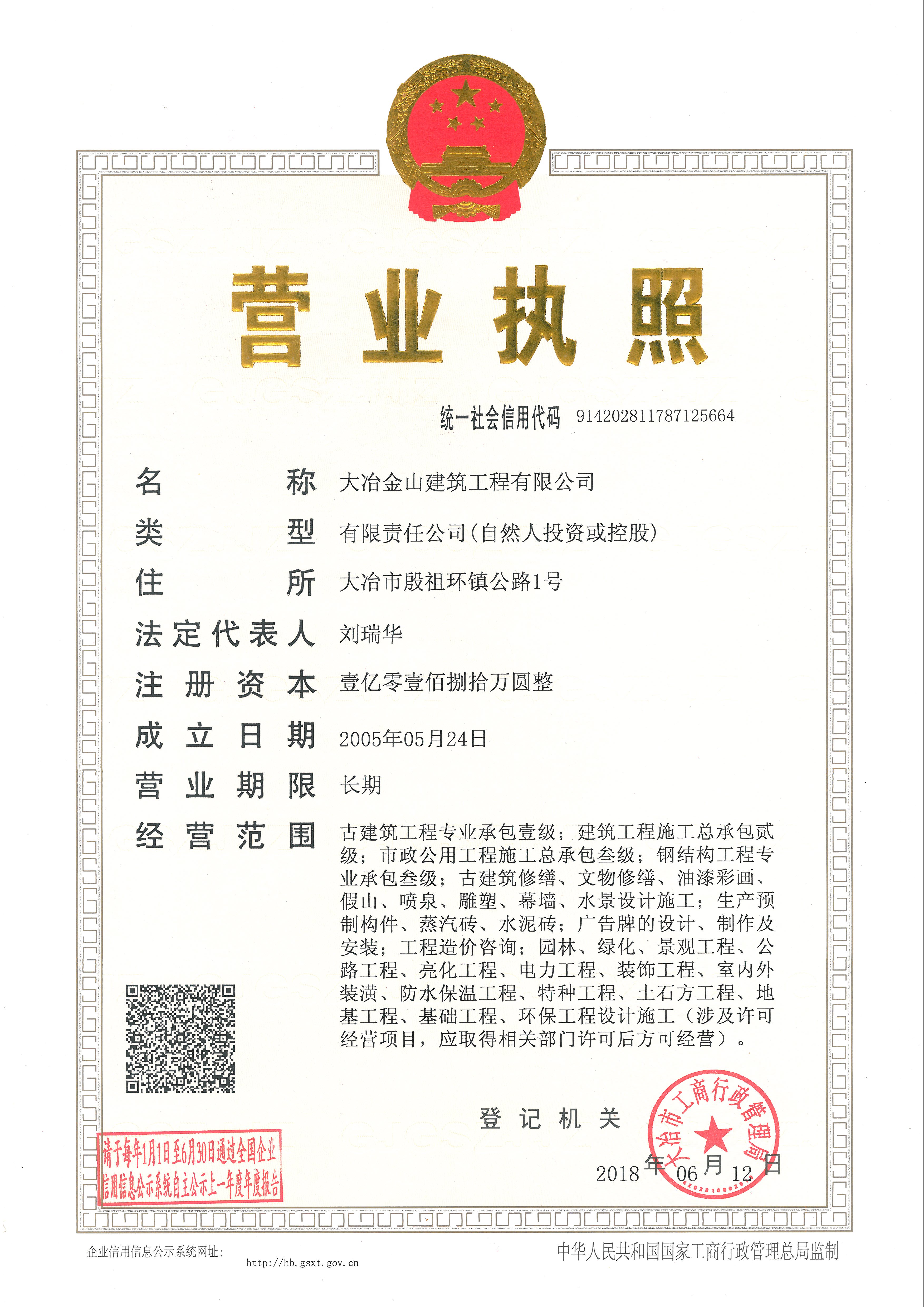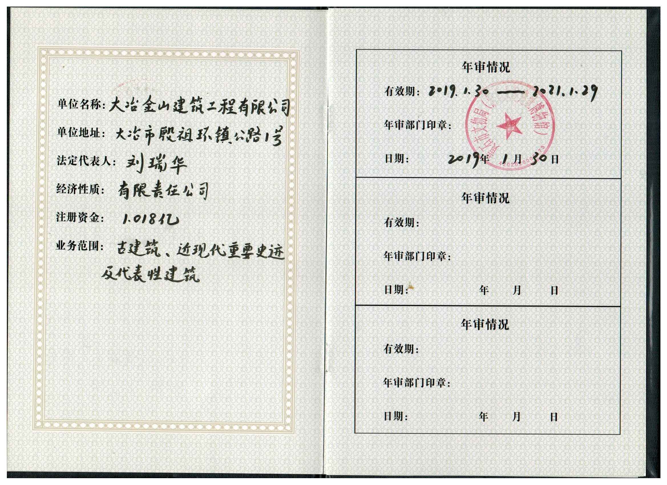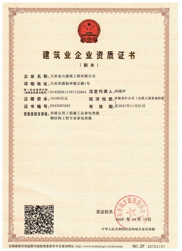 大冶金山建筑工程有限公司始建于1984年,屬鎮(zhèn)辦集體企業(yè)。1997年改制為大冶山建筑工程有限責(zé)任公司,屬股份制企業(yè)。2013年更名為大冶金山建筑工程有限公司,2018年3月公司資源重組,公司注冊資金達(dá)到10180.00萬元,公司法定代表人為劉瑞華。公司具有古建筑工程專業(yè)承包壹級、建筑工程施工總承包貳級、市政工程總承包叁級、鋼結(jié)構(gòu)工程專業(yè)承包叁級資質(zhì)。